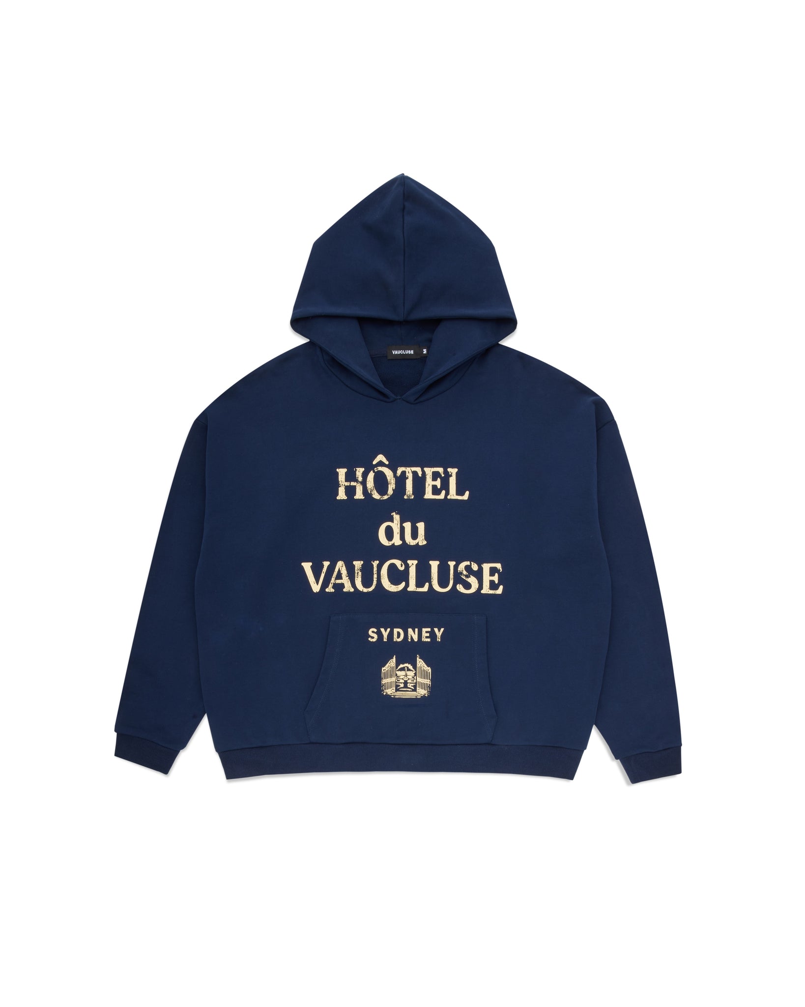Introducing the Hotel du Vaucluse Hoodie in Navy. Featuring our distressed Hotel du Vaucluse graphic across the chest and kangaroo pocket. Cut from a luxury French Terry 480gsm 100% cotton in our refined slightly cropped fit with signature cuff and waistband detailing.