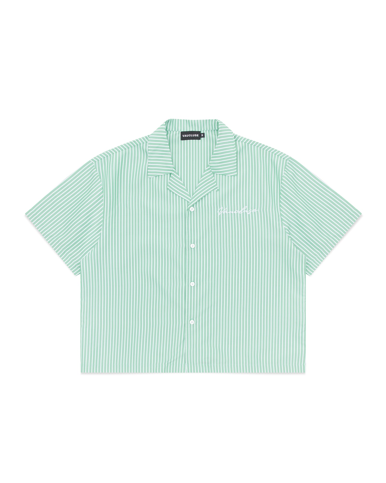 Introducing the Striped Signature Short Sleeve Shirt in Green/White for SS25. The shirt features one chest pocket with our signature logo embroidered into the upper left side. Cut to our signature refined boxy, slightly cropped fit making our short sleeve an outerwear essential.
